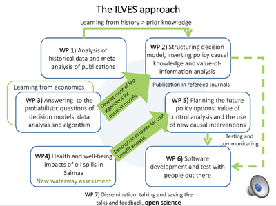 The modelling approach is strongly lead by Bayesian inference and decision analysis tools. The experiences of FEM group are used in developing and leading this process. The economic estimation and simulation models of VATT, together with the large datasets, are used to estimate economic changes. The UH/ECON will provide skills in the Bayesian time series analysis and in testing the theories given the observations. HUT will provide the models related to world wide food security and likely future risks. FMI will provide state of the art models to describe the emissions of shipping fleets, their atmospheric dispersion and impacts to the human health and the environment, LTU will provide knowledge in Bayesian mcmc analysis of complex models, the models used to manage logistic chains, and the expert knowledge and international expert views of Russian development having a potential impact on planned logistic pathways through Saimaa lake area. Åbo Akademi will provide expert knowledge in evaluation of current and potentially future national and international maritime legislation and its probabilistic impact on risks. KMRA will add to the stakeholder contacts and dissemination. City of Helsinki will provide expert knowledge in modelling logistics and an information end user aspect to the analysis. KYAMK will provide practical experience from maritime activities, and the databases of inland shipping routes and possibilities. University of Duke will provide Bayesian modelling skills in economic analysis and will contribute to oil spill management. CSIRO will provide Bayesian expertise in exploitation and risk analysis, analysis of insurances to increase the interest to avoid accidents, and expertise in oil spill risk analysis. FAN AND RICH: do we need Waikatu? Coul Duke provide the same services, or do your models require such expert skills that they can not be easily applied by other scientists than yourself only, i.e. how easily applicable they are to learn new methods ? Reason why I think Waikatu is that I would like to link practical and graphically educative (=supporting understanding the elements of future policy evaluations ?: University of Waikatu will provide expertise in the use of artifical intelligence methods to enable learning databases. Their WEKA software (LINK) is a leading software in AI field and provides effective data handling and use of Bayesian network models. The consortium offers an excellent combination of skills which are needed to support environmental and economic policy with modern calculus systems. Understanding correctly the real causal relationships in a system where society makes a new intervention must be based on as good causal understanding as possible. The priors of the models must use the existing published papers as effectively as possible. Here the modelling skills and expert understanding of ILVES consortium meet in a unique way to solve practical problems.