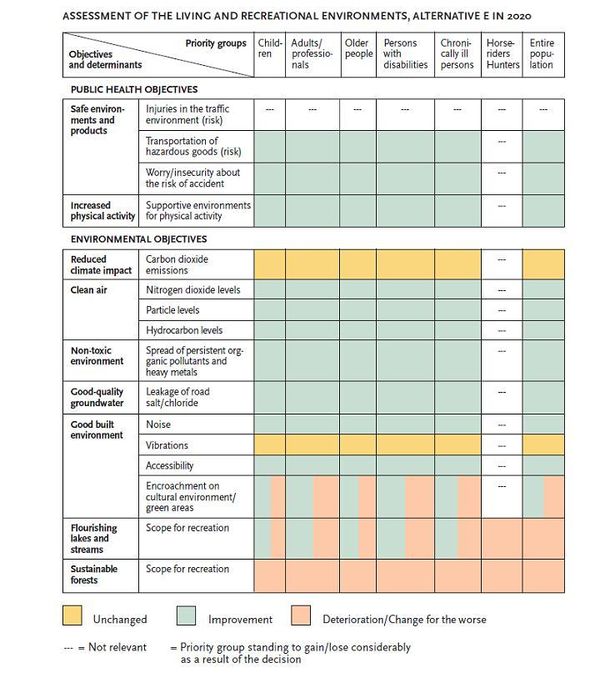 Figure 2. An example of an indicator scorecard, showing the health and environmental impacts of a road project in Sweden (Swedish National Institute of Public Health 2005).