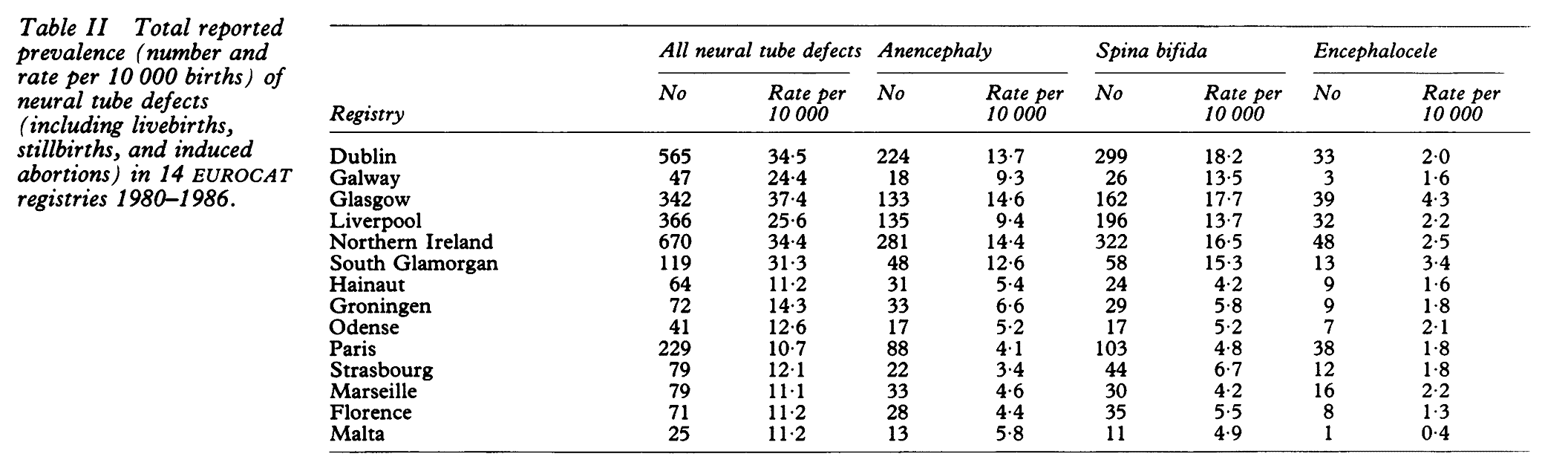 Media:EUROCAT_neural_tube_birth_defects.gif | Total reported prevalence (number and rate per 10 000 births) of neural tube defects including livebirths, stillbirths and induced abortions in 14 EUROCAT registries 1980-1986 | [1] | ||||||||||||||||||||||||||||||||||||||||||||||||||||||||||||||||||||||||||||||||||||||||||||||||||||||||||||||||||||||||||||||||||||||||||||||||||||||||||||||||||||||||||||||||||||||||||||||||||||