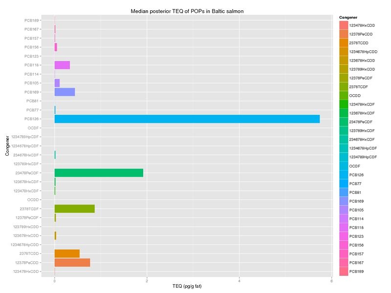 POP concentrations in Baltic sea fish have been measured from samples collected in EU-kalat project. The original data of individual fish samples is accessible through Opasnet base. This data is used here for a Bayesian model to calculate posterior concentration distributions (median and SD) for each congener. This data is then translated into TEQ, and can be used for health benefit assessment of Baltic salmon.