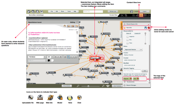 | Epistemic mediation | Creating and working with knowledge artefacts. The aim is to give support for users to create, transform and organize shared knowledge artefacts, to support commenting on shared artefacts (object-bound commenting and chat), and development of shared artefacts (drafting and versioning iteratively), as well as sustained use of knowledge artefacts and conceptualizations. |