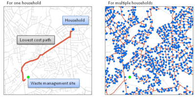 The route model simulates routes between an origin (e.g. a household) and a destination (a waste management site). At its simplest, this can be done just by finding the shortest distance between the two. More realistically, the model can allow for differences in the cost of travelling along each route - for example, depending on traffic speed, road tolls or other barriers. Here, different cost weights were assigned to different road types.