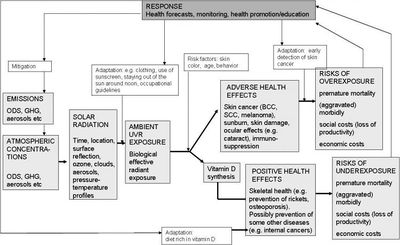 In the case of environmental health, we are concerned primarily with the relationships between environment (as a source of exposure to hazards or access to resources) and human health. These relationships comprise a set of causes and effects – and typically involve many of each (i.e. many-to-many relationships). They are best represented, therefore, in the form of a causal chain or web (also known as the ‘full impact chain’), showing the links between sources and impacts, via a series of steps. This outline summarises the approach taken to developing a conceptual model of the UVR issue.