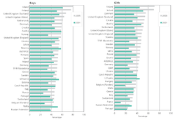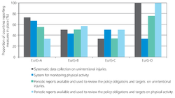 Overall, every grouping (with the exception of EurG-C) reports having more monitoring and data collection systems in place for unintentional injuries than for physical activity. In EurG-A countries there is a higher emphasis on data collection than reporting, whereas in the EurG-D grouping a higher percentage of countries use periodic reports to review policy obligations and fewer report having a monitoring system in place for physical activity (Fig. 27). Without systematic monitoring, it is difficult to determine the effectiveness of periodic reports in these countries. On the other hand, countries with effective monitoring systems in place should focus more on using the data collected in these periodic reports.[1]