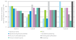 All country groupings pay attention to unintentional poisoning but emphases vary when it comes to unintentional injury during leisure activities (see, for example, the low level of policy measures in EurG-C and EurG-D countries) and injuries at home (the low level of policy measures in the EurG-B and EurG-C countries). The relatively low overall scores for home and leisure injuries are of concern, as injuries in those settings are a major burden in Europe. It is estimated that 78 000 deaths were caused by home and leisure injuries in 2005, with the eastern part of Europe (especially the Baltic countries) experiencing the highest mortality rates.