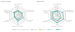 Policy profiles for unintentional injuries unrelated to traffic and physical activity covering the six aspects (policy development, implementation and enforcement, accountability for health, health sector involvement, equity considerations and provision of information to public) reveal similar and symmetrical patterns between country groupings. The main exception is the implementation and enforcement aspect of the physical activity policy profile, which ranges from 0% to 70% and thereby indicates that different groups of countries show very different degrees of implementation and enforcement of policy. Implementation and enforcement are also recognized as the weakest dimension for both physical activity policies as well as injury-related policies: only for this policy dimension do the values drop below 20%. Similarly, for both health issues policy development is not very strong. In comparison, the involvement of the health sector is quite strong in most country groupings, with EurG-C countries reporting the lowest involvement levels in both cases.[1]