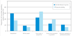 Three topics from regional priority goal II were selected for policy screening in the policy survey: road traffic injuries, unintentional injuries (excluding road traffic) and physical activity. A total of 33 Member States replied, although responses did not always include all topics. This assessment focuses on unintentional injuries (excluding road traffic injuries) and physical activity. Road traffic injuries have been extensively reviewed elsewhere in a recent WHO report.