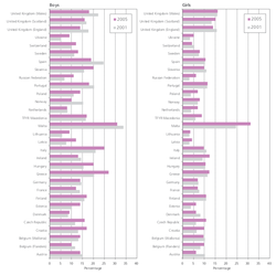 Although the study was based on self-reported activity (as opposed to objective measurement), it revealed that in all countries a considerable proportion of children and adolescents do not reach the recommended levels of physical activity. Among 11-year-old boys, only 38% achieved the recommended levels of activity in the Russian Federation and 80% in Ireland in 2005/2006. For girls of the same age, these rates ranged from 24% in Portugal to 71% in Finland.