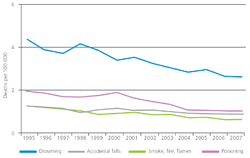 Some of the major causes of death from unintentional injury involving children and adolescents in the Region are drowning, poisoning, falls and fires. Death rates from all four causes have declined since 1995, but current rates are still high in many countries and vary greatly across the Region. Death rates in children and adolescents are generally lowest in western Europe and highest in some eastern European countries and newly independent states. This inter-country inequality in child injury mortality is extremely pronounced. Countries with the highest and lowest rates differ: