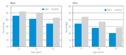 Results from the Health Behaviour in School-aged Children study 2005/2006 show that, compared to 2001/2002, the proportion of young people engaging in moderate to vigorous physical activity generally increased in all three age groups examined (those aged 11, 13 and 15 years). It is not certain that this trend will continue, but the data do suggest that efforts to encourage physical activity can be successful. Now a central challenge is to figure out how to sustain activity as children get older. Trends in obesity are less promising and the impact of increased physical activity levels does not seem to be well-reflected in these figures. From 2001 to 2005, the proportion of overweight and obese young people increased in many countries for both boys and girls; only in three did it decrease.