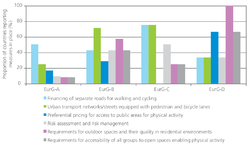 Where policy measure for promoting physical activity are concerned, many countries try to encourage the building of networks for cycling and walking either through a separation of paths for walking and cycling (EurG-A and EurG-C countries) or the development of urban transport networks or streets equipped with pedestrian and bicycle lanes (EurG-B and EurG-C countries). Countries in EurG-D mainly focus on the accessibility and quality of the available open and public spaces to promote activity. Solutions associated with the transport system do not play a major role in these countries.[1]